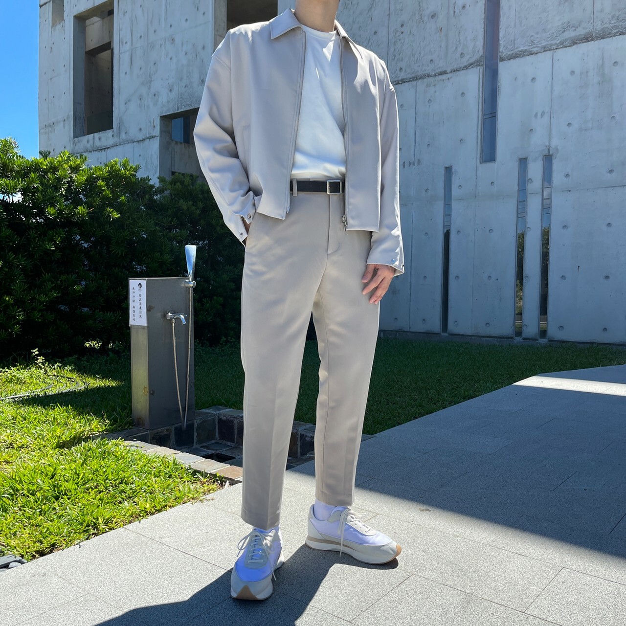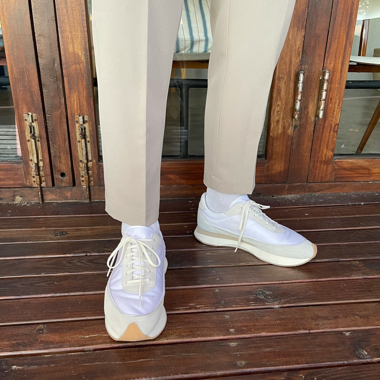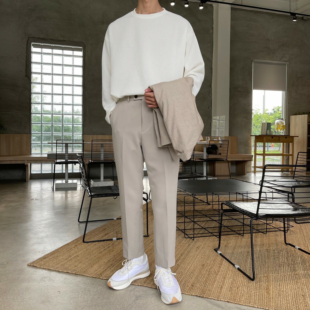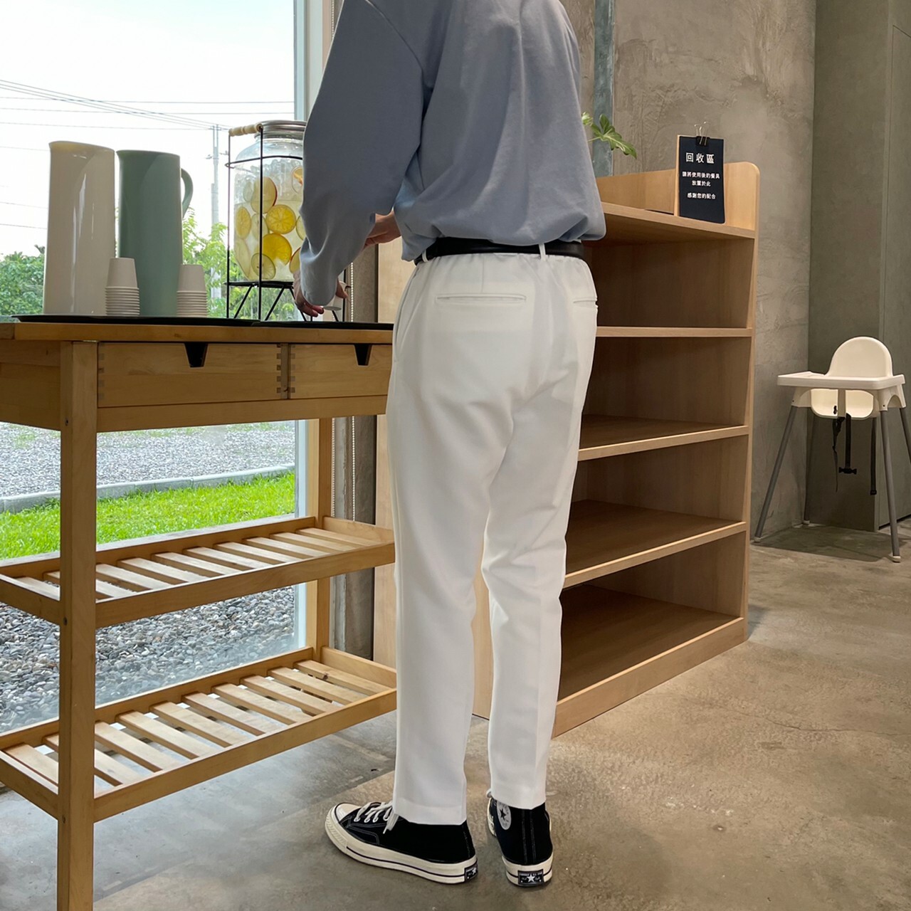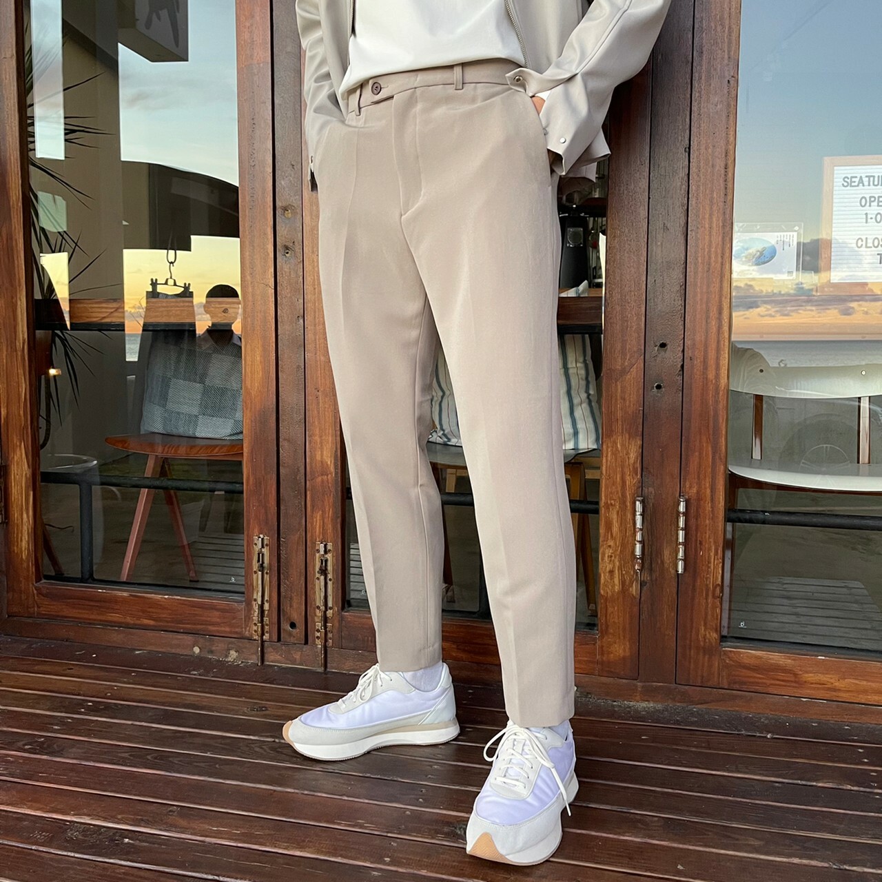 176cm 71kg / 32w / M(卡其-著運動鞋者/ 白-拿橘色書籍者)