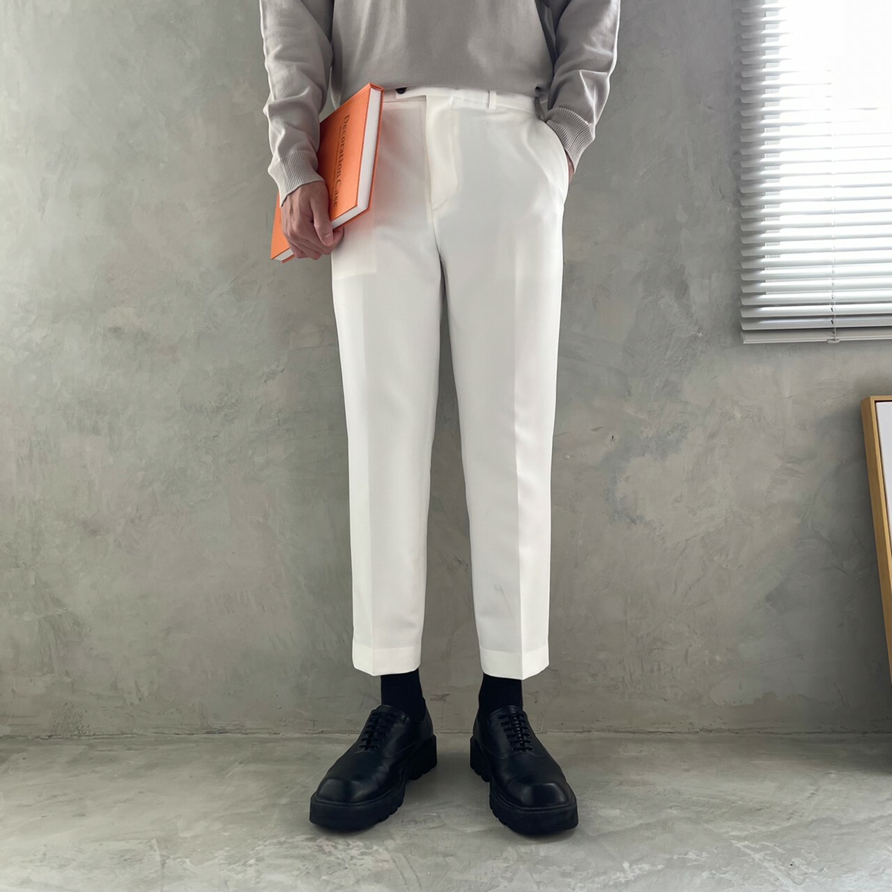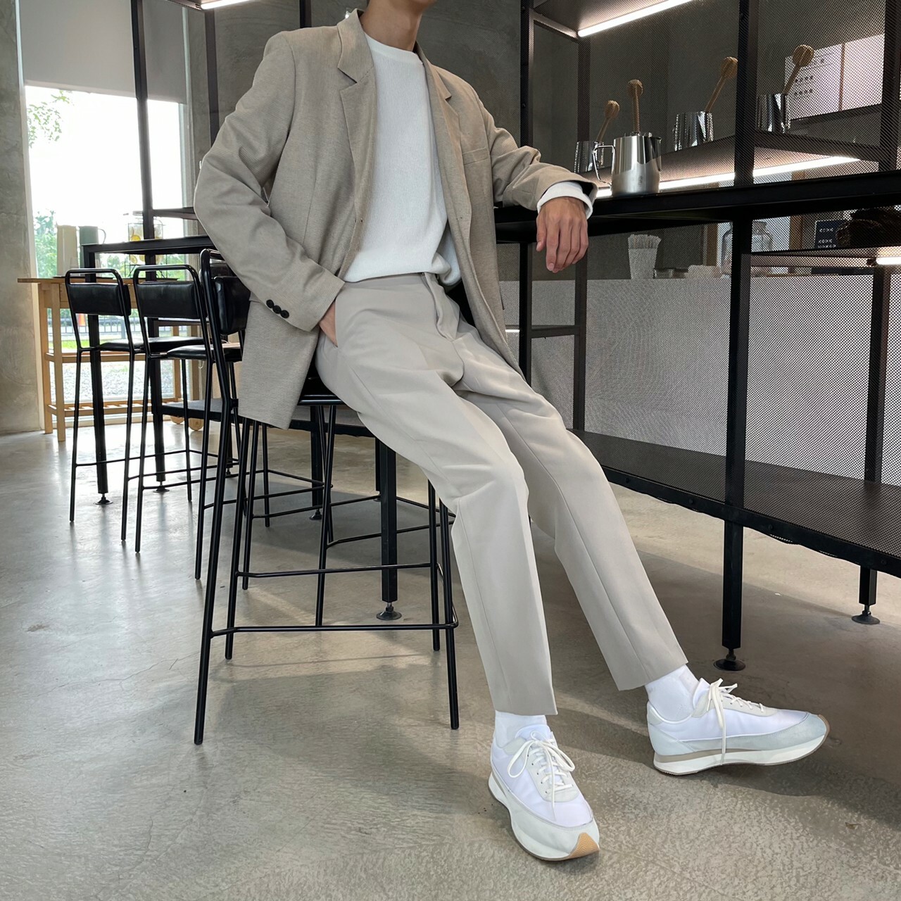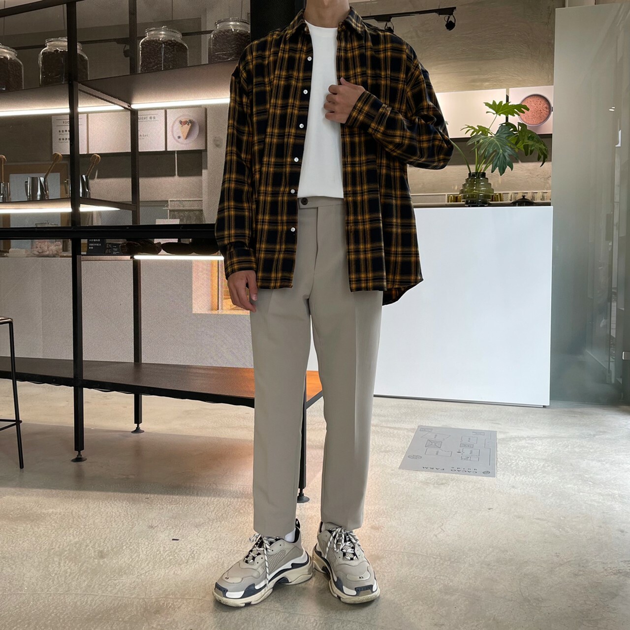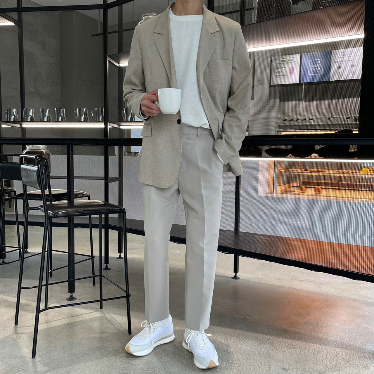 176cm 71kg / 32w / M(卡其-著運動鞋者/ 白-拿橘色書籍者)
