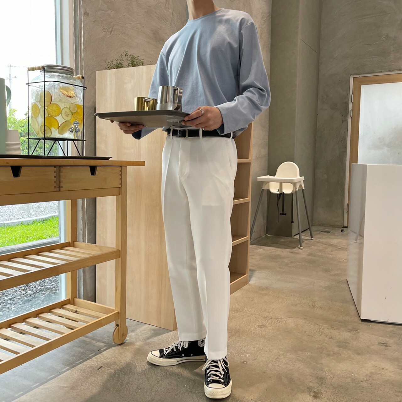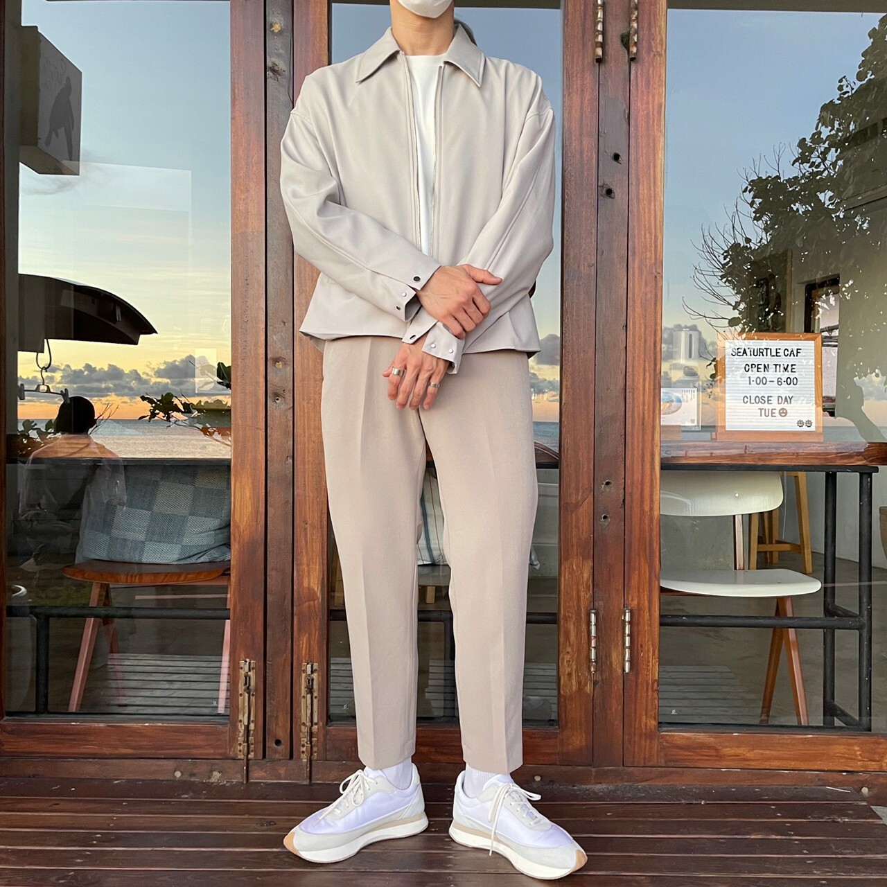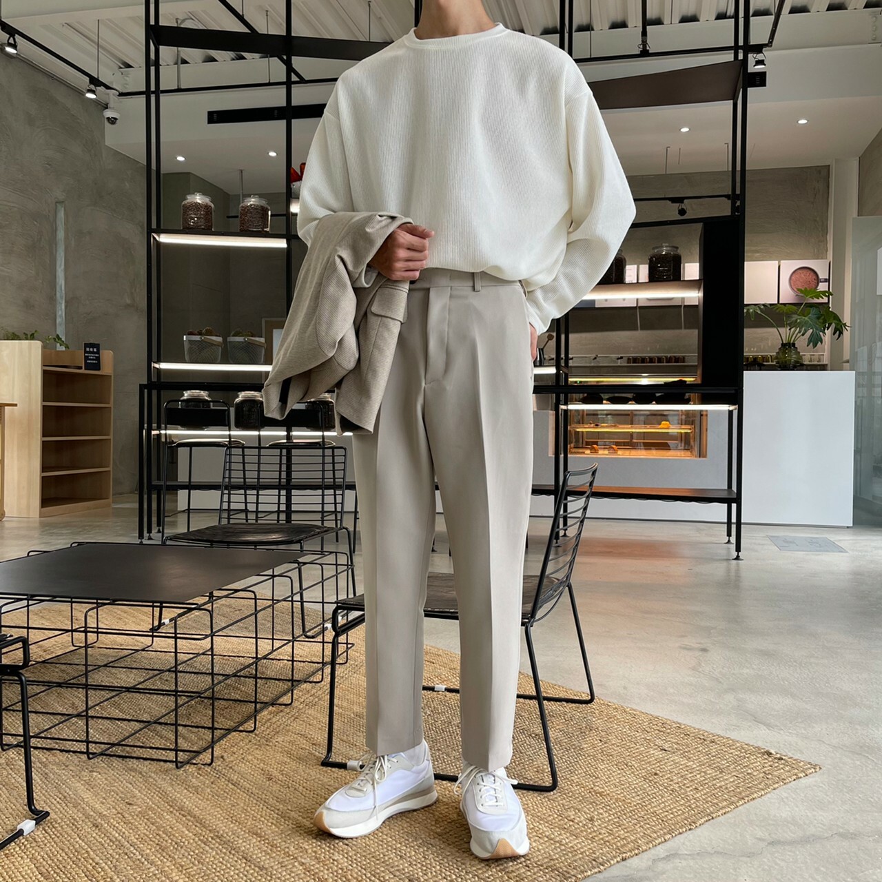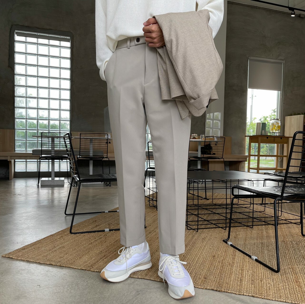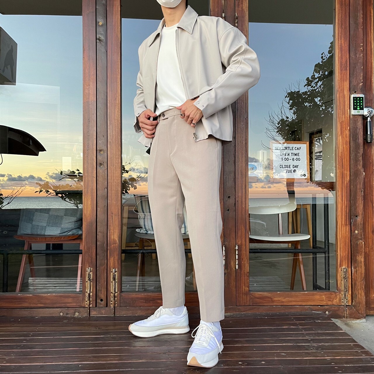 176cm 71kg / 32w / M(卡其-著運動鞋者/ 白-拿橘色書籍者)