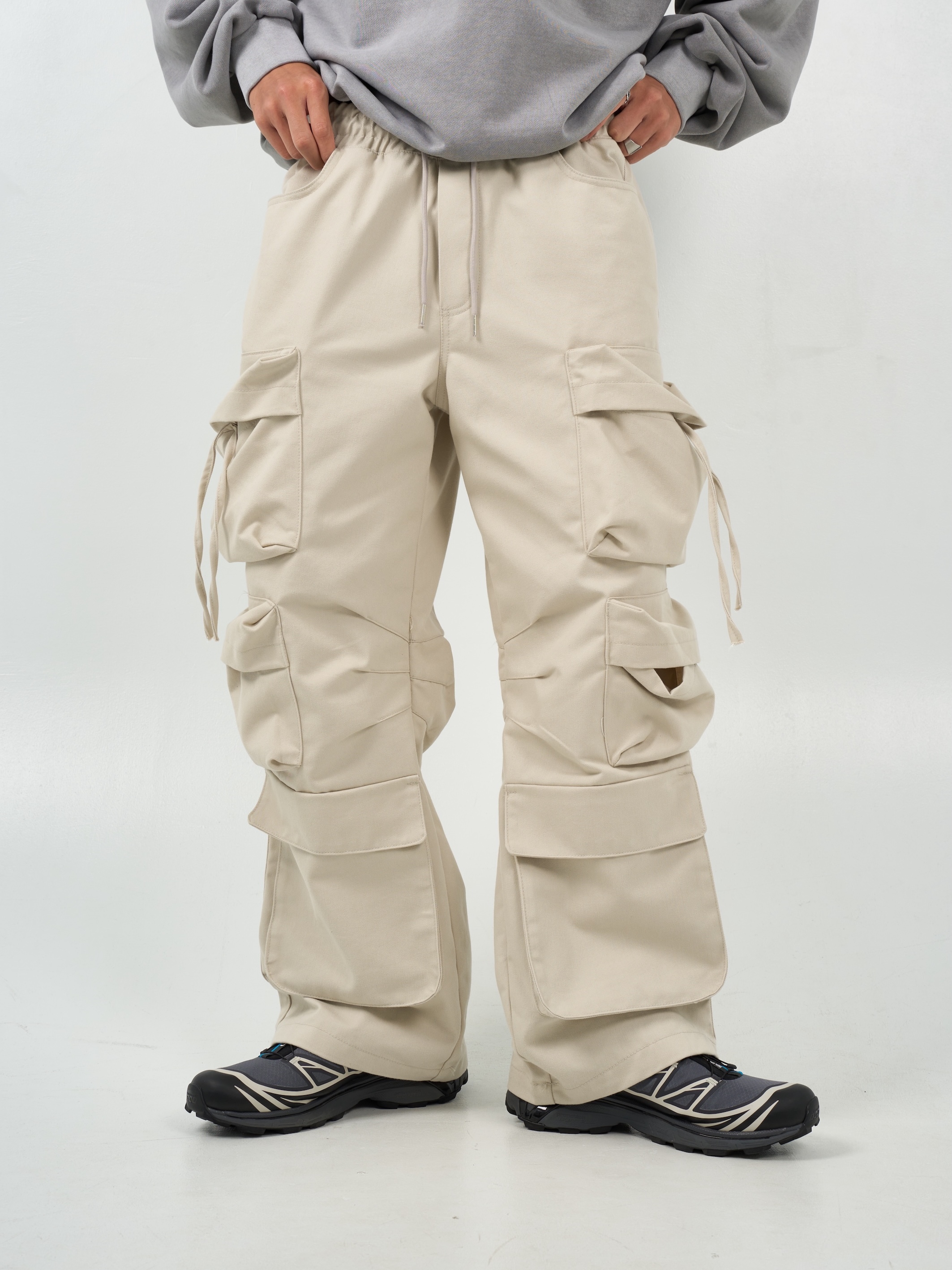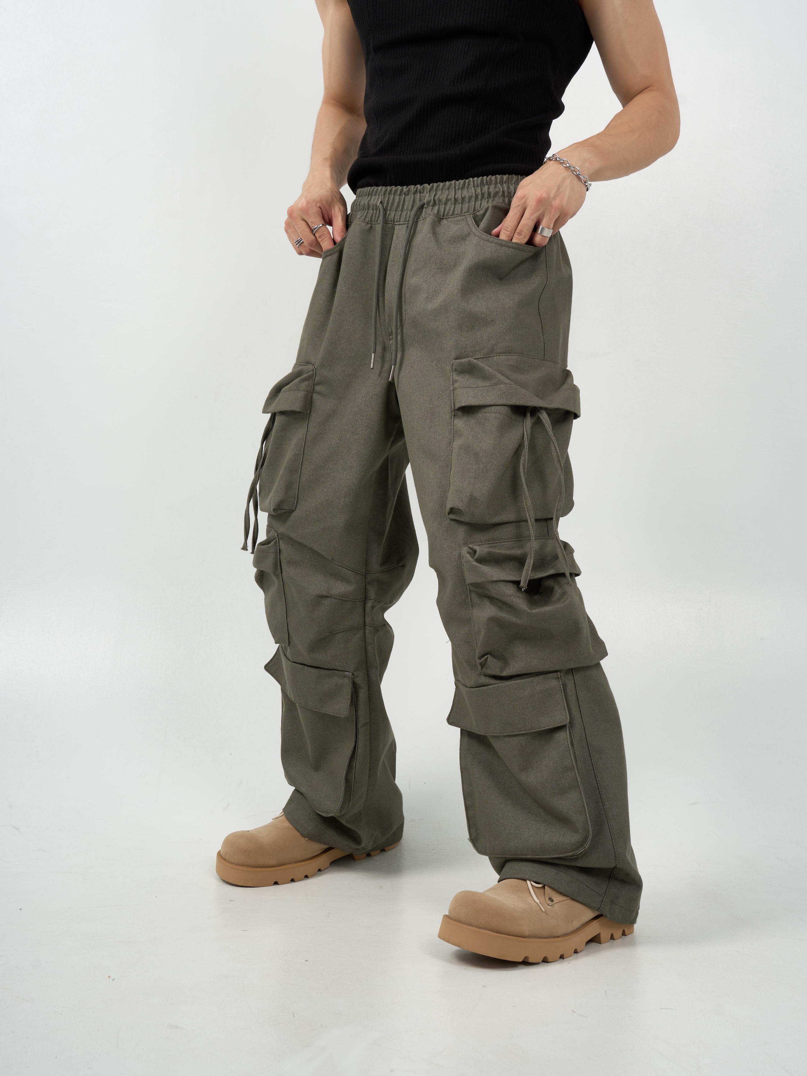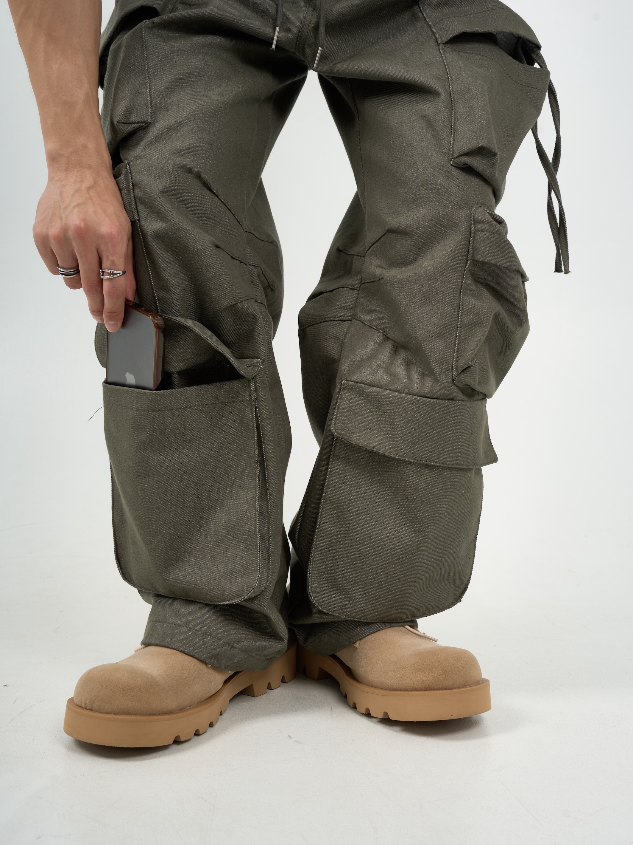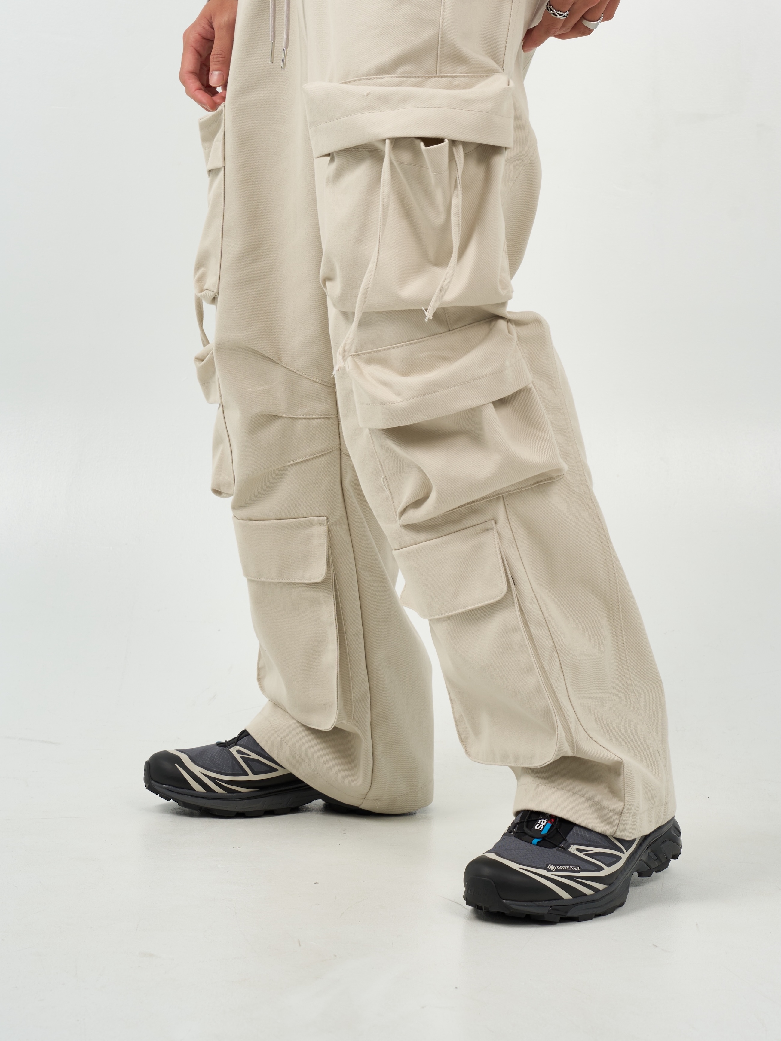 -腰圍抽繩調節,經典少見多口袋設計-高磅面料,硬挺版型,上身更有氣勢-側面抽繩點綴,膝側剪裁小巧思