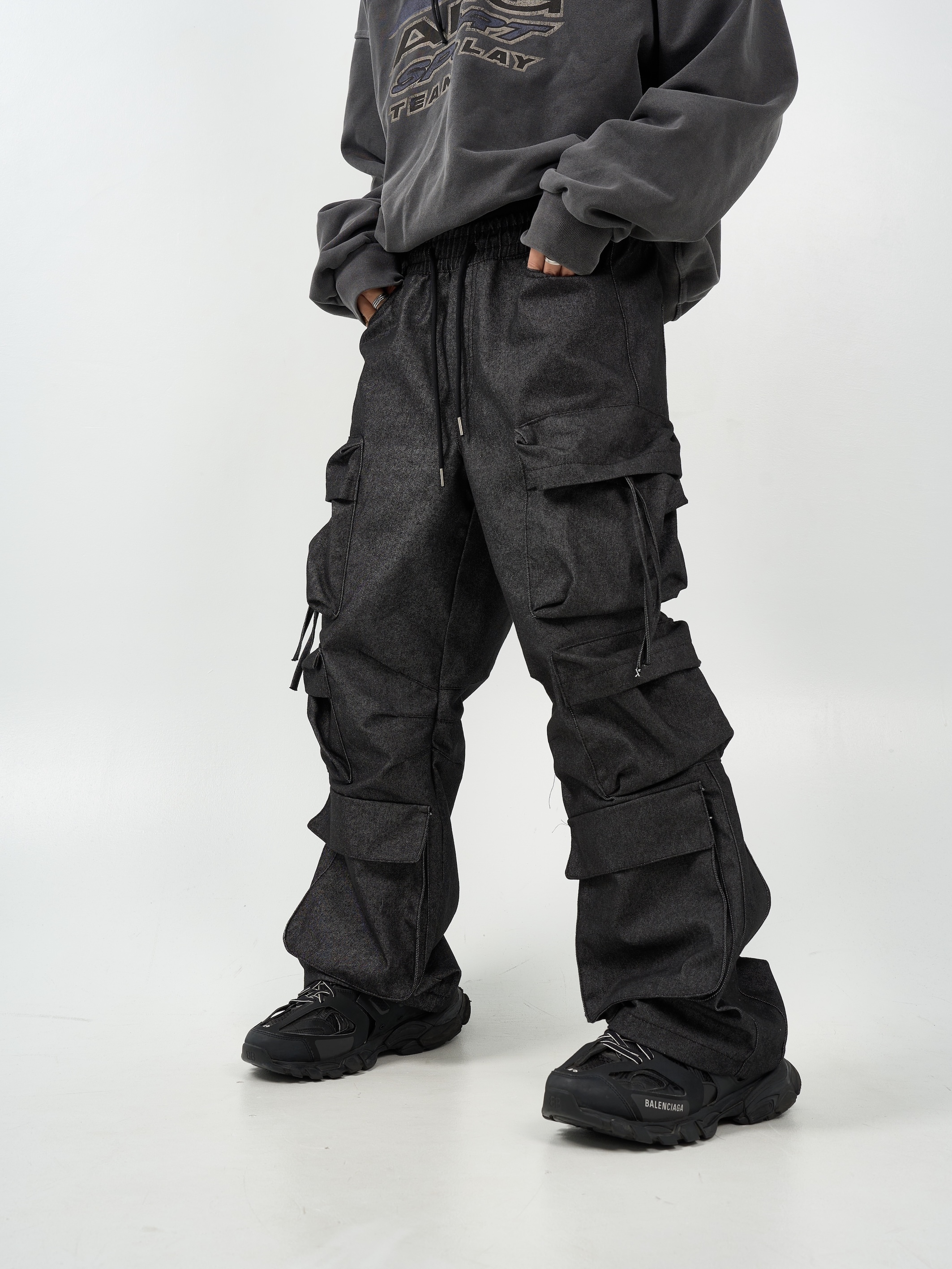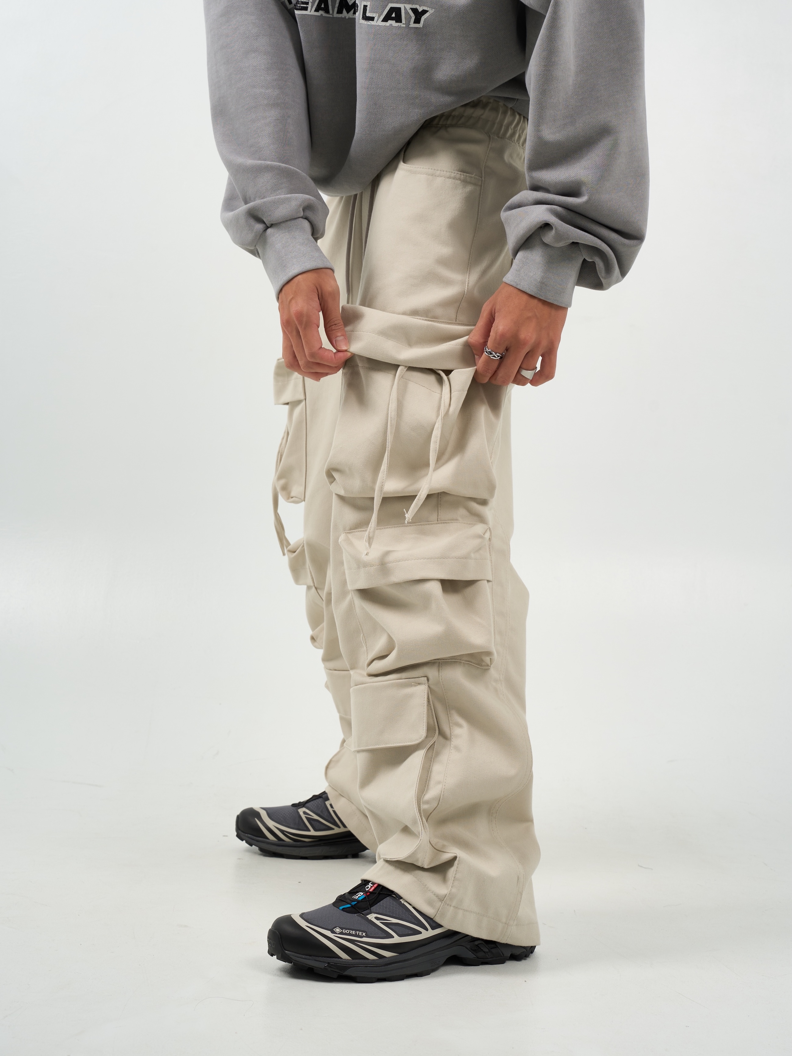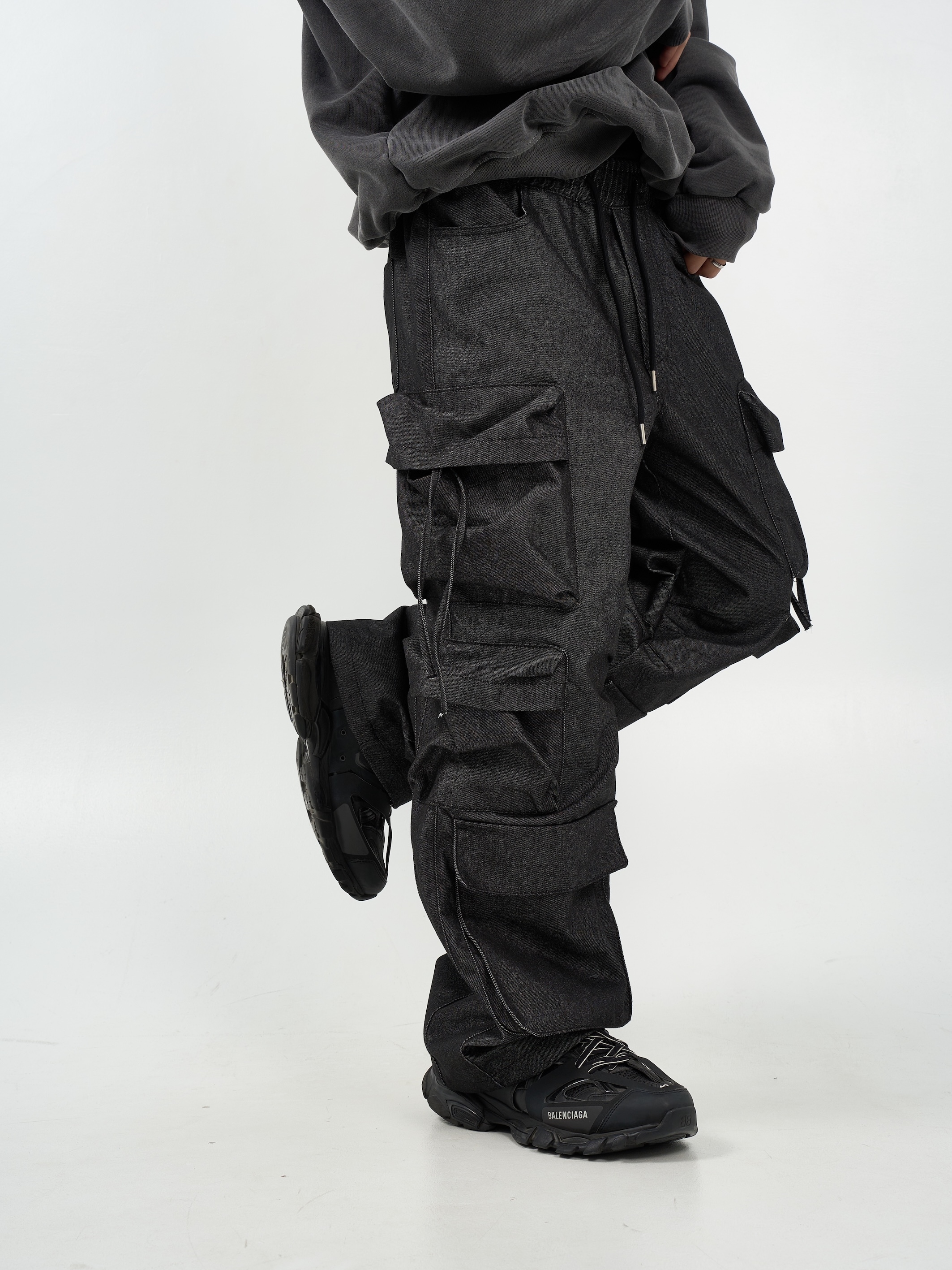 -腰圍抽繩調節,經典少見多口袋設計-高磅面料,硬挺版型,上身更有氣勢-側面抽繩點綴,膝側剪裁小巧思