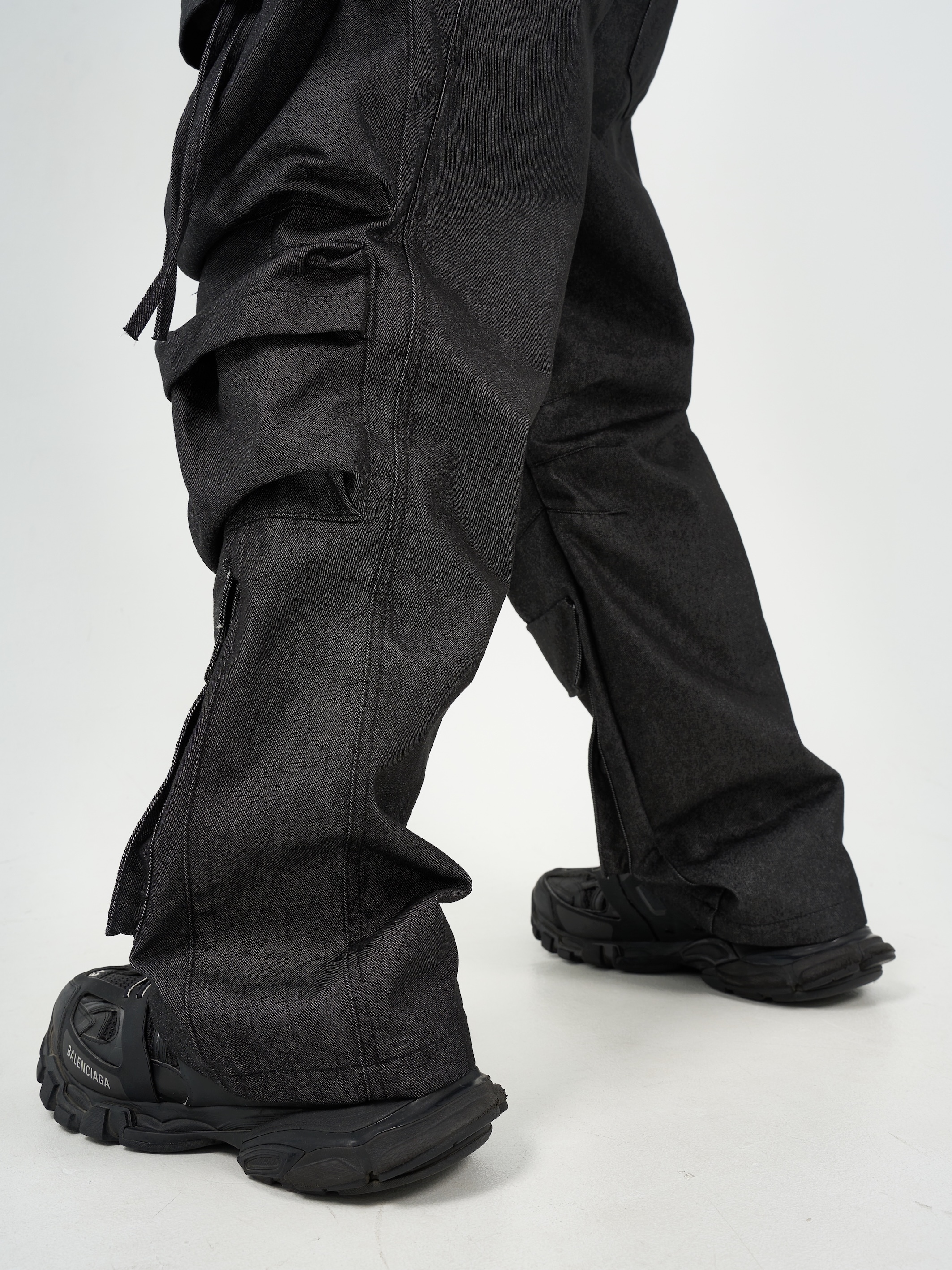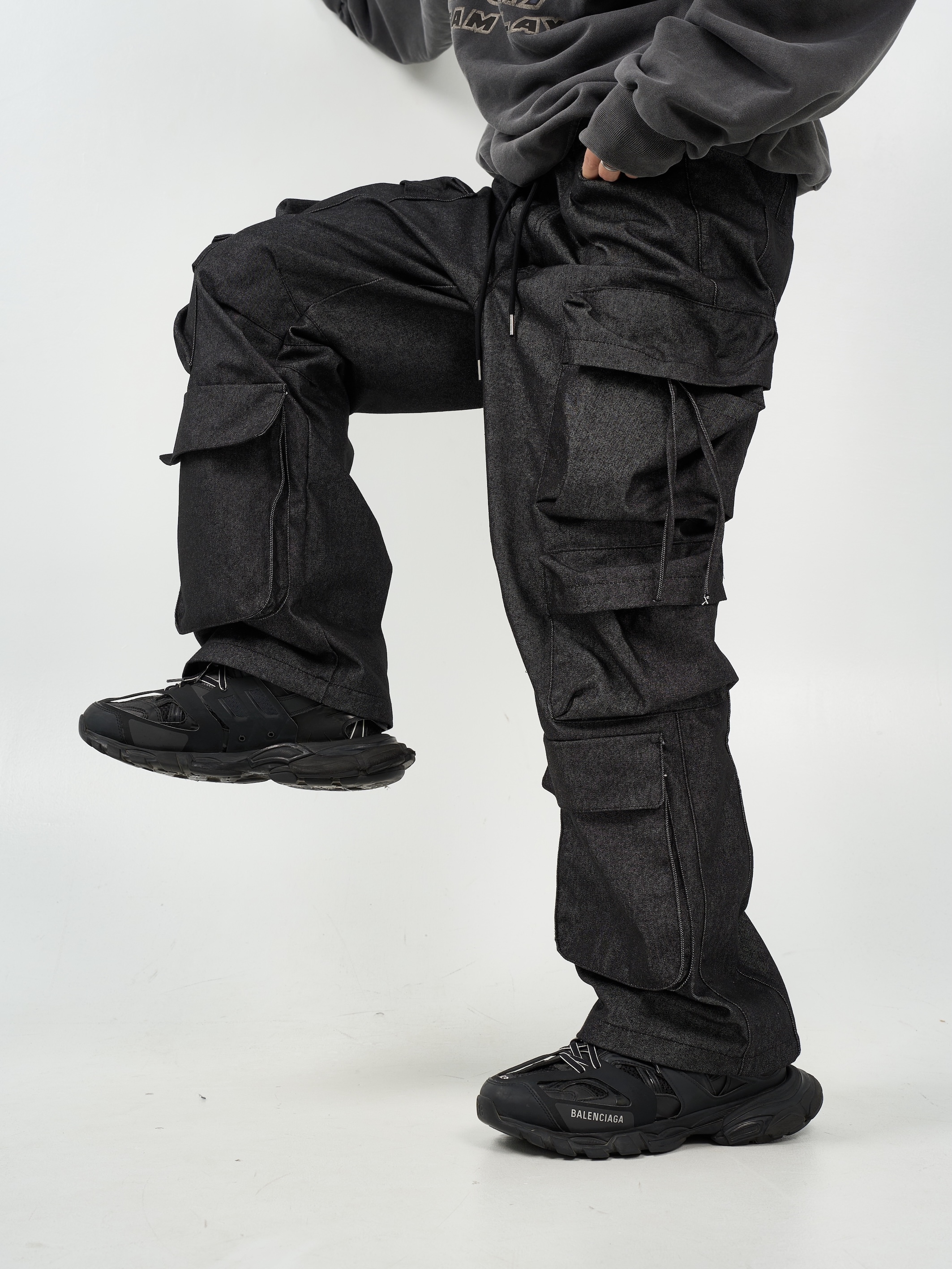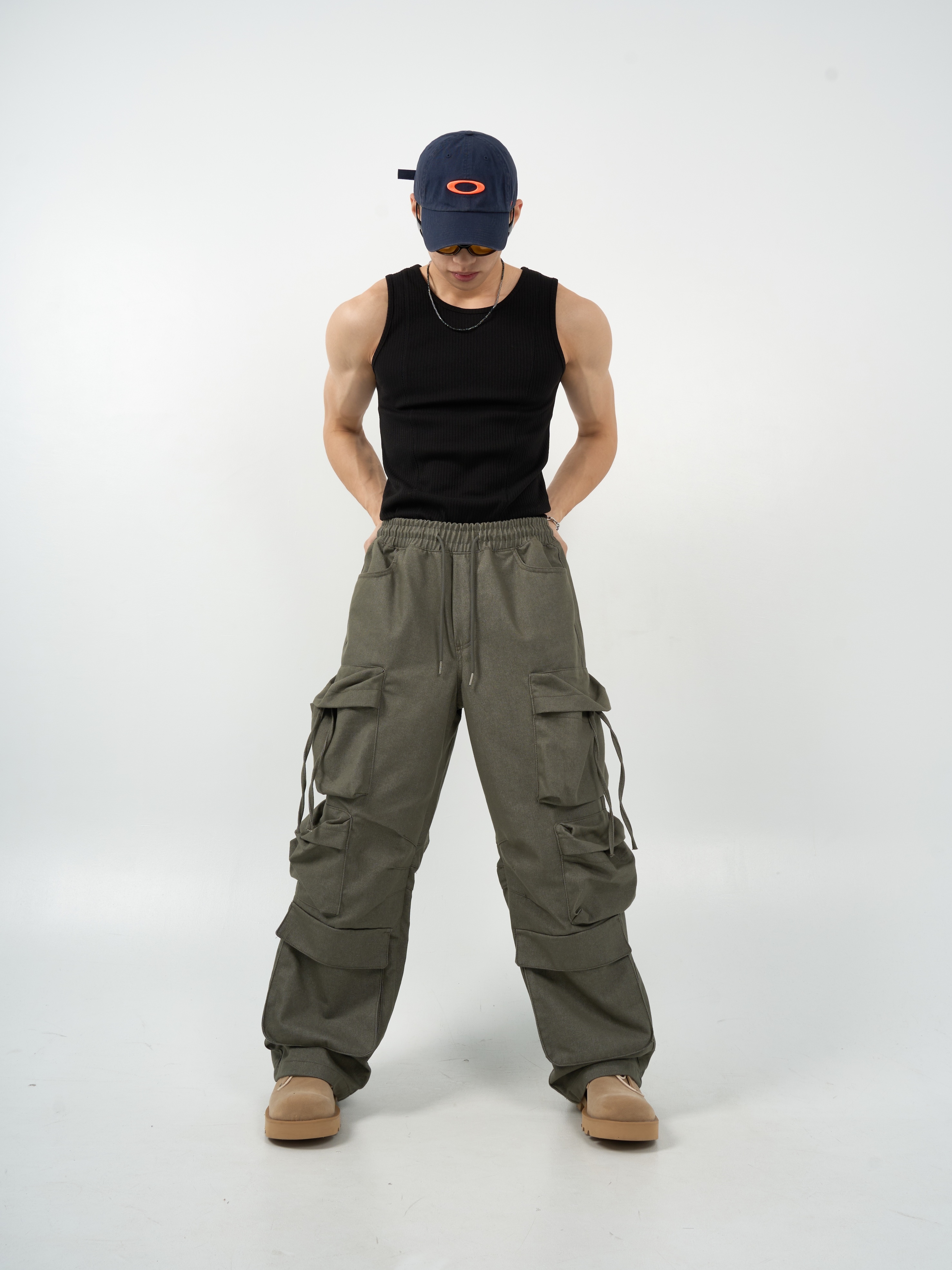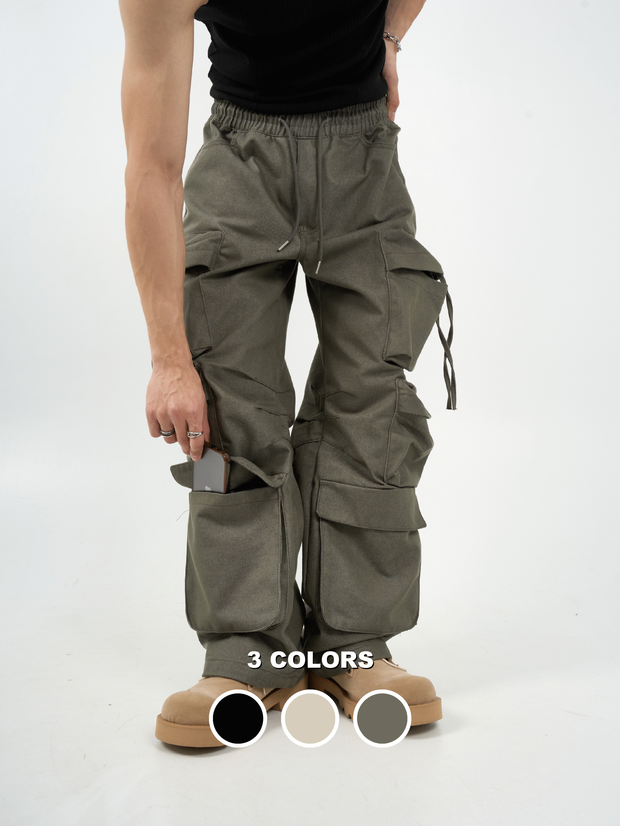 -腰圍抽繩調節,經典少見多口袋設計-高磅面料,硬挺版型,上身更有氣勢-側面抽繩點綴,膝側剪裁小巧思